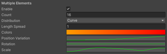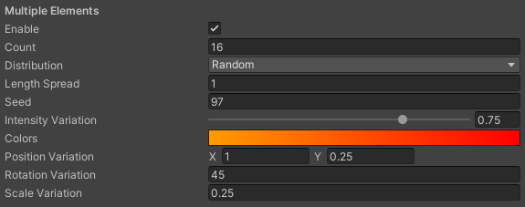 A value of **1** appears the same as a single lens flare element. | | Distribution | Select the method that Unity uses to generate multiple lens flare elements: