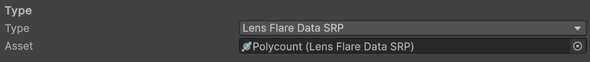 • [Polygon](#Polygon) | #### Image ![](images/LensFlareShapeImage.png) | **Property** | **Description** | | --------------------- | ------------------------------------------------------------ | | Flare Texture | The Texture this lens flare element uses. | | Preserve Aspect Ratio | Fixes the width and height (aspect ratio) of the **Flare Texture**. You can use [Distortion](#Distortion) to change this property. | #### Circle ![](images/LensFlareShapeCircle.png) | **Property** | **Description** | | ------------ | ------------------------------------------------------------ | | Gradient | Controls the offset of the circular flare's gradient. This value ranges from 0 to 1. | | Falloff | Controls the falloff of the circular flare's gradient. This value ranges from 0 to 1, where 0 has no falloff between the tones and 1 creates a falloff that is spread evenly across the circle. | | Inverse | Enable this property to reverse the direction of the gradient. | #### Polygon ![](images/LensFlareShapePolygon.png) | **Property** | **Description** | | ------------ | ------------------------------------------------------------ | | Gradient | Controls the offset of the polygon flare's gradient. This value ranges from 0 to 1. | | Falloff | Controls the falloff of the polygon flare's gradient. This value ranges from 0 to 1, where 0 has no falloff between the tones and 1 creates a falloff that is spread evenly across the polygon. | | Side Count | Determines how many sides the polygon flare has. | | Roundness | Defines how smooth the edges of the polygon flare are. This value ranges from 0 to 1, where 0 is a sharp polygon and 1 is a circle. | | Inverse | Enable this property to reverse the direction of the gradient | #### Ring ![](images/LensFlareShapeRing.png) | **Property** | **Description** | | --------------- | -------------------------------------------------------------- | | Gradient | Controls the offset of the circular flare's gradient. This value ranges from 0 to 1. | | Falloff | Controls the falloff of the circular flare's gradient. This value ranges from 0 to 1, where 0 has no falloff between the tones and 1 creates a falloff that is spread evenly across the circle. | | Inverse | Enable this property to reverse the direction of the gradient. | | Amplitude | Amplitude of the sampling of the noise. | | Repeat | Frequency of the sampling for the noise. | | Speed | Scale the speed of the animation. | | Ring Thickness | Ring Thickness. | #### Lens Flare Data Driven SRP ![](images/LensFlareShapeLensFlareDataSRP.png) | **Property** | **Description** | | --------------- | ------------------------------------------------------------ | | Asset | Lens Flare Data SRP asset as an element. | Unity support an Lens Flare Data SRP recursive, but with a hard cutoff after 16 recursions call. For instance asset A constains asset B which constains asset A (infinite recursion). That will trigger a warning and execution 16 recursions: ~~~~~~ "LensFlareSRPAsset contains too deep recursive asset (> 16). Be careful to not have recursive aggregation, A contains B, B contains A, ... which will produce an infinite loop." ~~~~~~ ## Color ![](images/LensFlareColor.png) | **Property** | **Description** | | ----------------------- | ------------------------------------------------------------ | | Color Type | Select the color type of Lens Flare Element this asset creates: