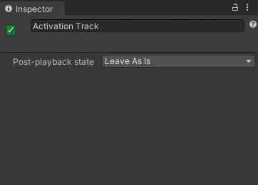 |**Post-playback state**||Sets the activation state for the bound GameObject when the Timeline asset stops playing. The Post-playback state applies to the Timeline asset and all of its Timeline instances.|