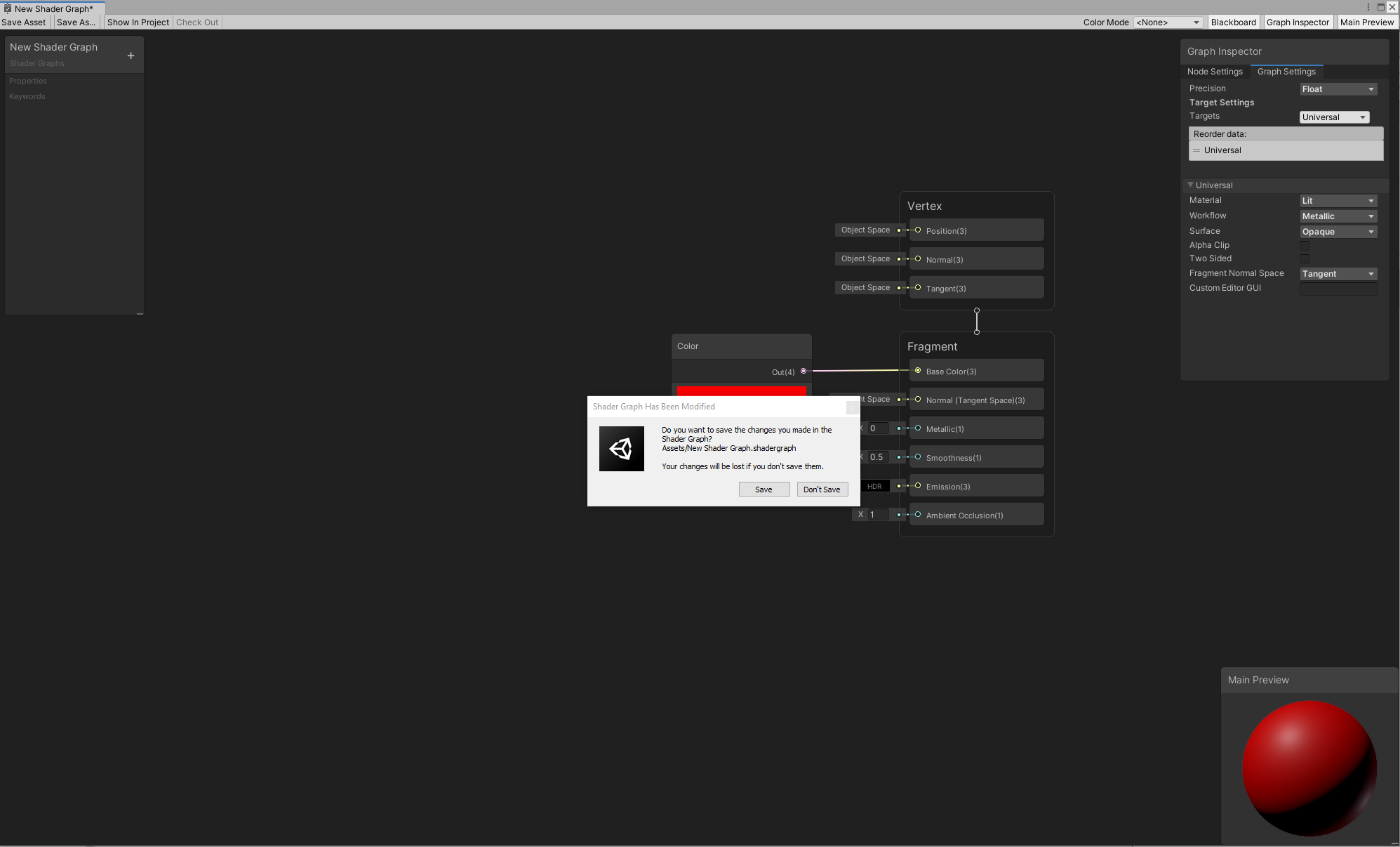 2. Close the graph. If Unity detects any unsaved changes, a pop-up window appears, and asks if you want to save those changes.