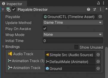 The Playable Director component stores the link between a Timeline instance and a Timeline asset. The Playable Director component controls when the Timeline instance plays, how the Timeline instance updates its clock, and what happens when the Timeline instance finishes playing.