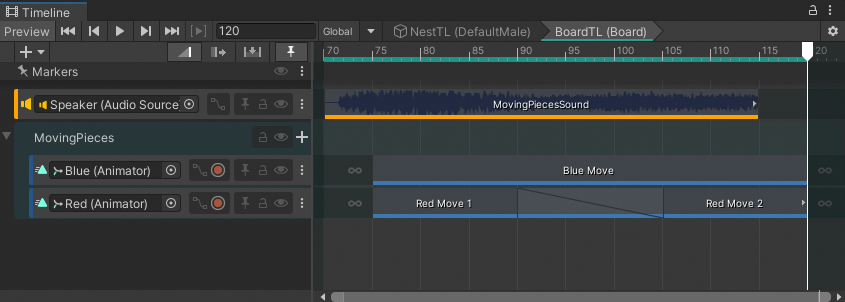 Each menu item and the Timeline title displays the name of the Timeline asset and its associated GameObject in the current Scene. For example, the Timeline asset named GroundATL is associated with the Ground GameObject. In this case, the Timeline title displays GroundATL (Ground).