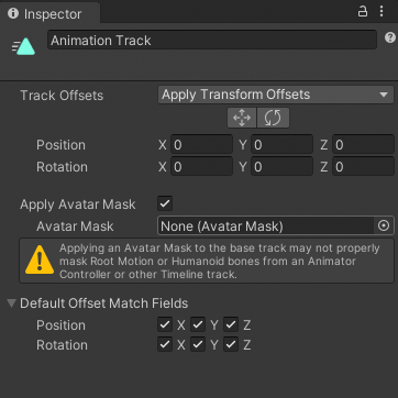 For example, select an Animation track to set how track offsets are applied, use an avatar mask, and select which transforms are modified when matching offsets between Animation clips.