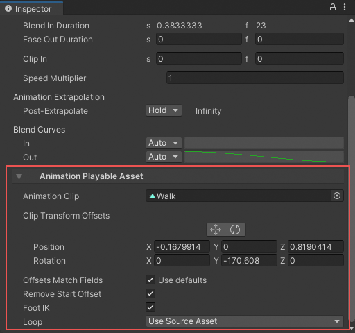 Select the Animation clip in the Timeline window and, in the Inspector window, expand Animation Playable Asset.