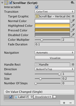 On Value Changed A UnityEvent that is invoked when the current value of the Scrollbar changes. The event can send the value as a float type dynamic argument.
