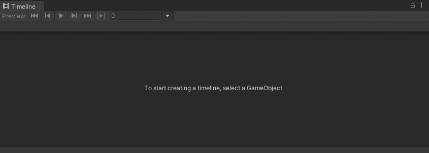 If you haven’t selected a GameObject, the Timeline window informs you that the first step for creating a Timeline asset and a Timeline instance is to select a GameObject.